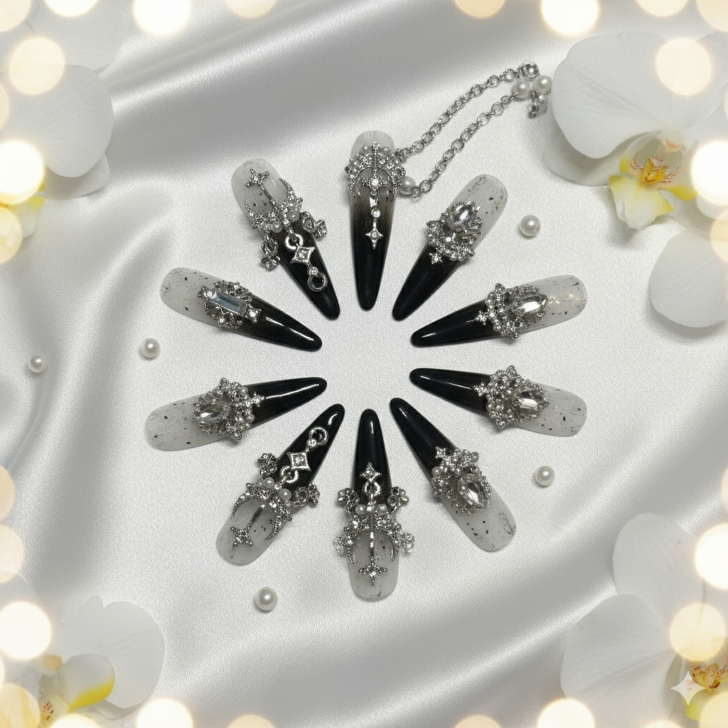 Set against a dramatic mix of jet black, milky white glitter, and breathtaking black-to-white ombre, each nail is meticulously crafted with an opulent stack of 3D silver-tone charms, blending gothic romance with pure luxury.